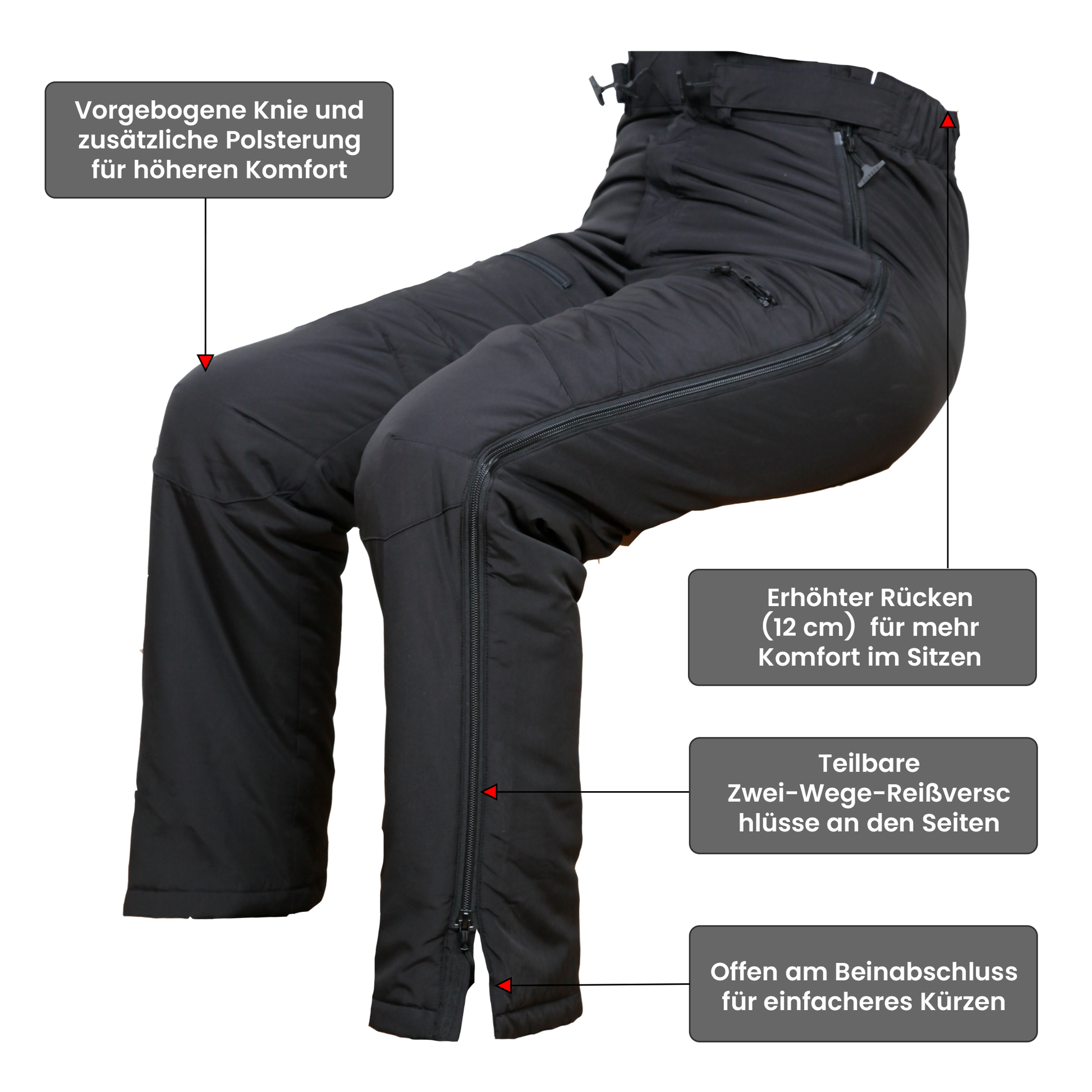 Zwei leicht zugängliche Taschen an den Oberschenkeln erleichtern die Nutzung im Sitzen, und die Seitenreißverschlüsse enden 8 cm über dem Saum, was die Hose einfacher zu kürzen macht. Die Knie sind vorgeformt und zusätzlich gepolstert, um Wärme und Bewegungsfreiheit genau dort zu bieten, wo sie am meisten gebraucht werden.